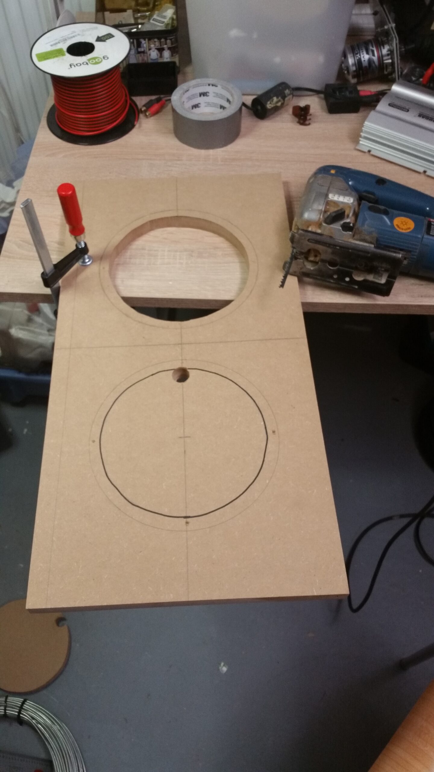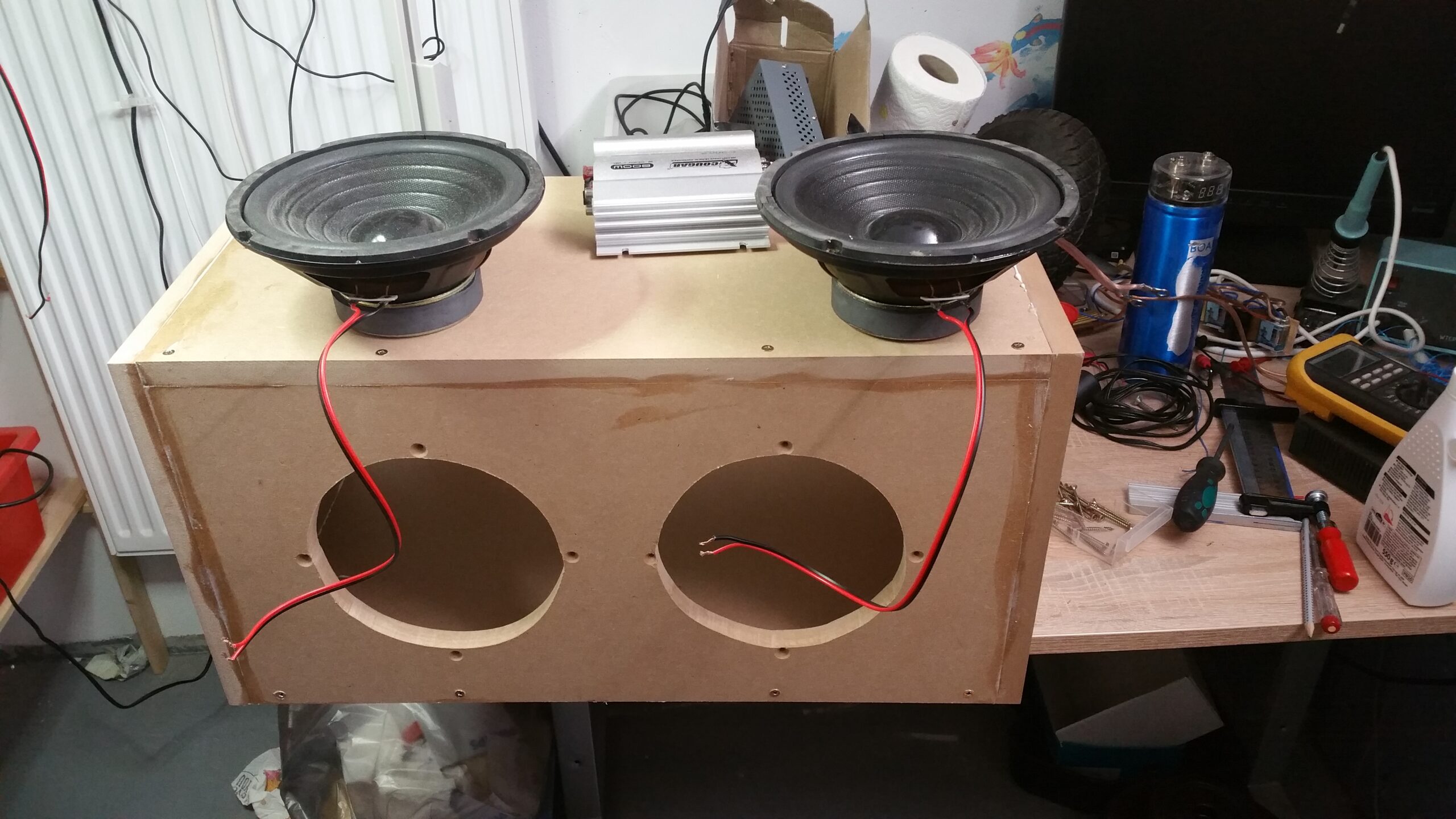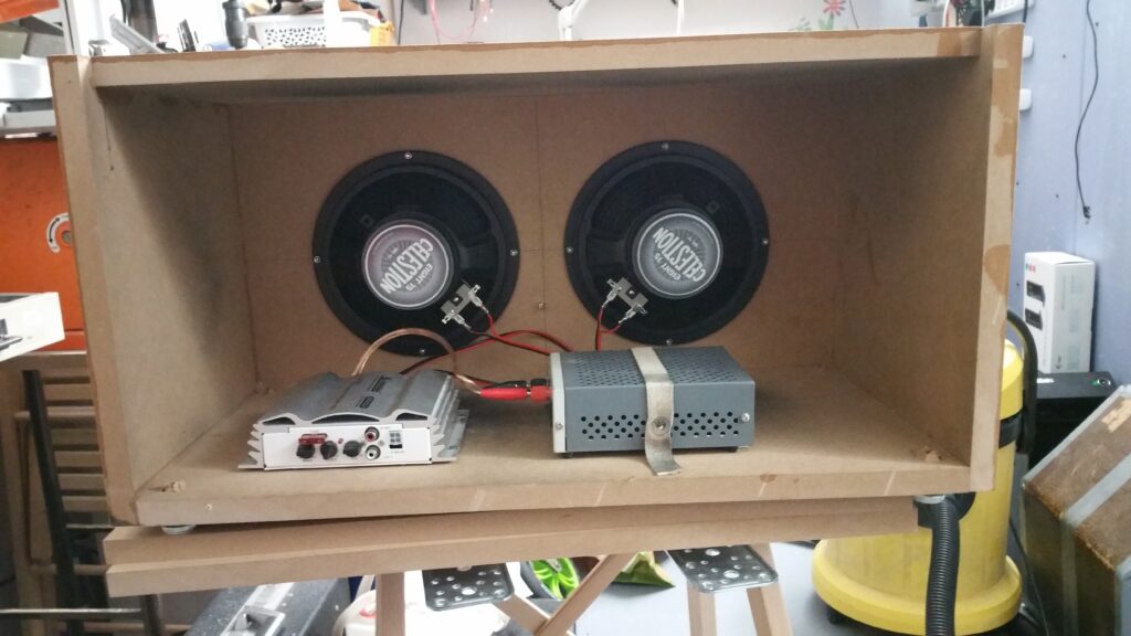 … fertig. Man sieht den Stereo Car-Amp (12V, das Netzteil liegt dahinter). Zunächst hab ich es mit alten Lautsprechern aus einer Boom-Box versucht. Das Klang so schlecht, dass ich doch noch ein paar Mark investiert habe um richtige Speaker zu kaufen.
